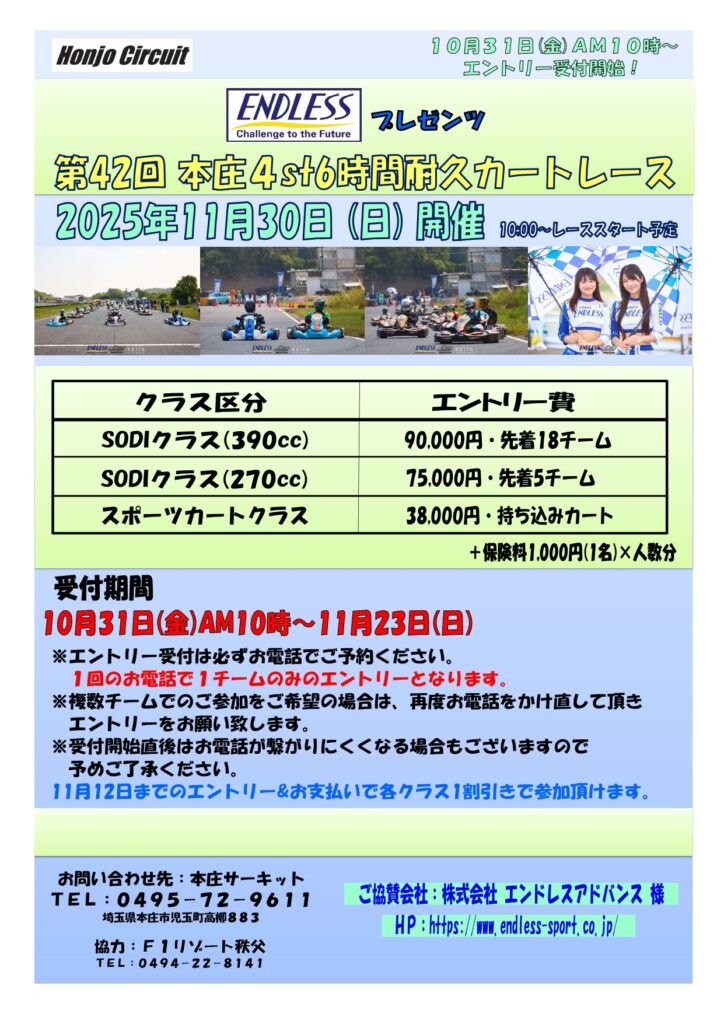ENDLESSプレゼンツ 第42回 本庄4st6時間耐久カートレース2025 投稿日 2025年10月20日 著者 honjostaff カテゴリー カートイベント 2025年11月30日(日)開催!開催クラスはSODI390cc&270cc・スポーツカートの3クラス10月31日(金)AM10時から受付開始となります。参加申込書2025年8月31日 第41回 開催時Produce by InspireSpaceMedia 様 - シェア - ツイート - ブックマーク - LINE - Pocket - Pinterest - コピー この記事を書いた人 honjostaff 記事一覧