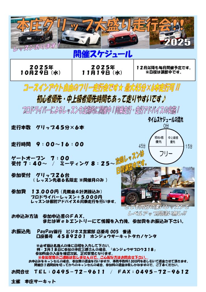 本庄グリップ大盛り走行会 投稿日 2025年3月17日 更新日 2025年10月31日 著者 honjostaff カテゴリー イベント カテゴリー グリップイベント 次回、2025年11月19日(水)開催!参加者募集中です♪たくさん走行できます!初心者優先と中上級者優先時間もありますので走りやすいです。参加申込書Webエントリーの方はこちらWebエントリー用 参加誓約書※昼食は各自でご用意ください。2025年10月の開催は終了しました。皆様のご参加ありがとうございました。 - シェア - ツイート - ブックマーク - LINE - Pocket - Pinterest - コピー この記事を書いた人 honjostaff 記事一覧