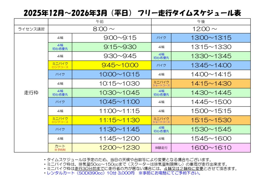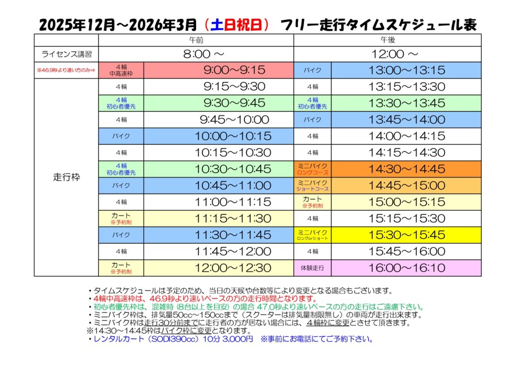冬季期間は、9:15~9:30枠は4輪の方の走行枠となります。