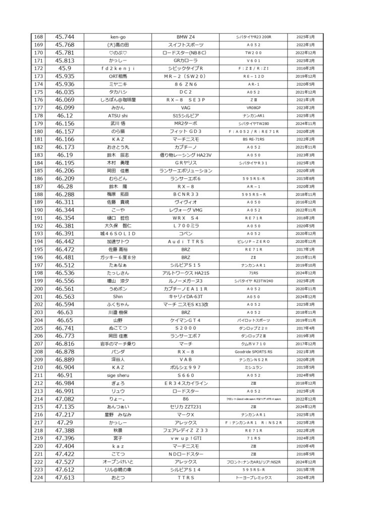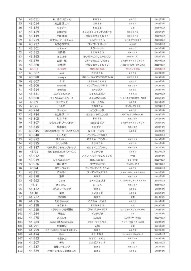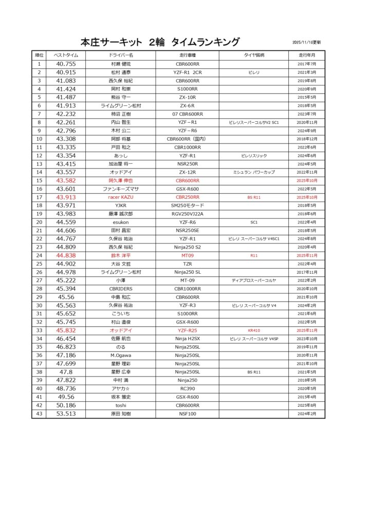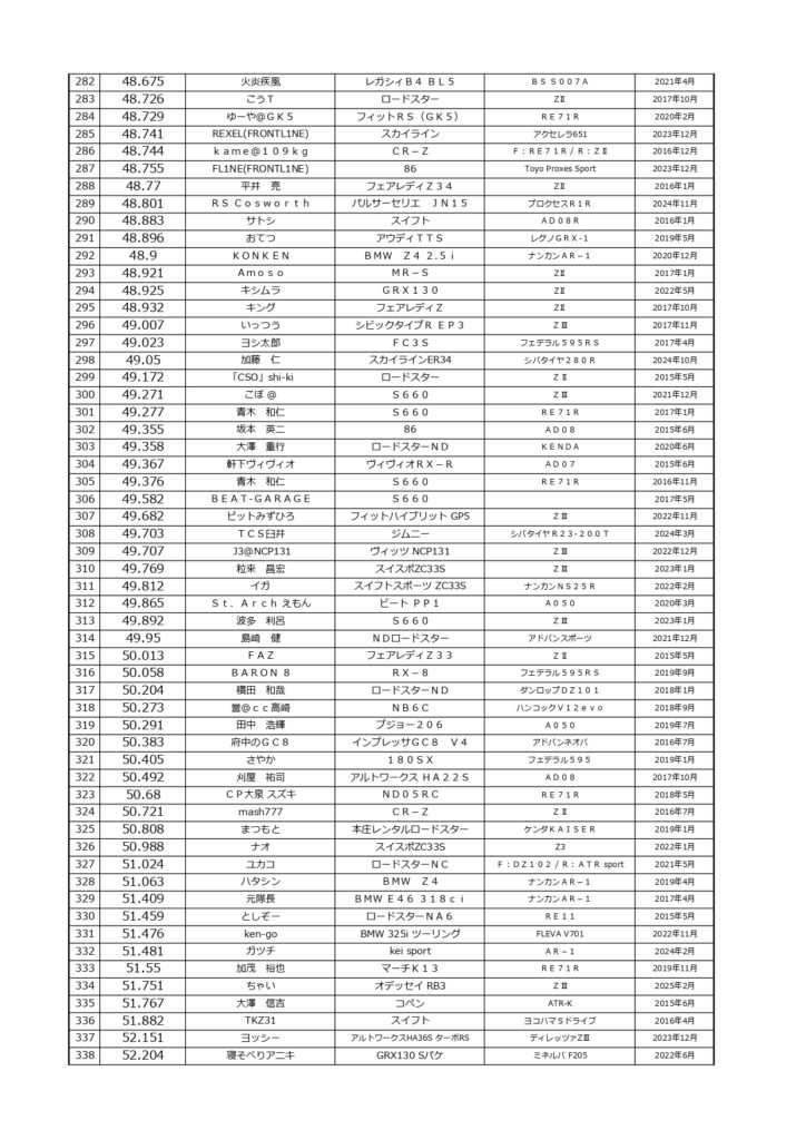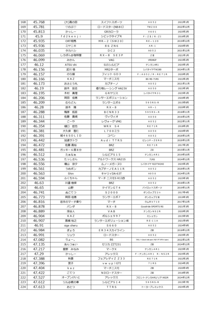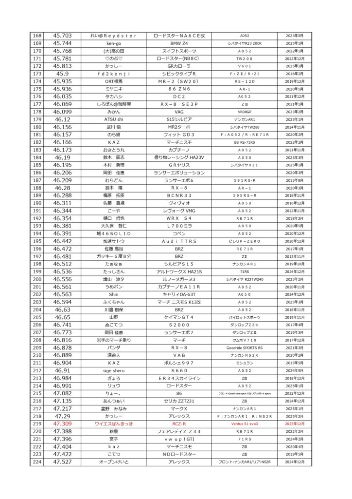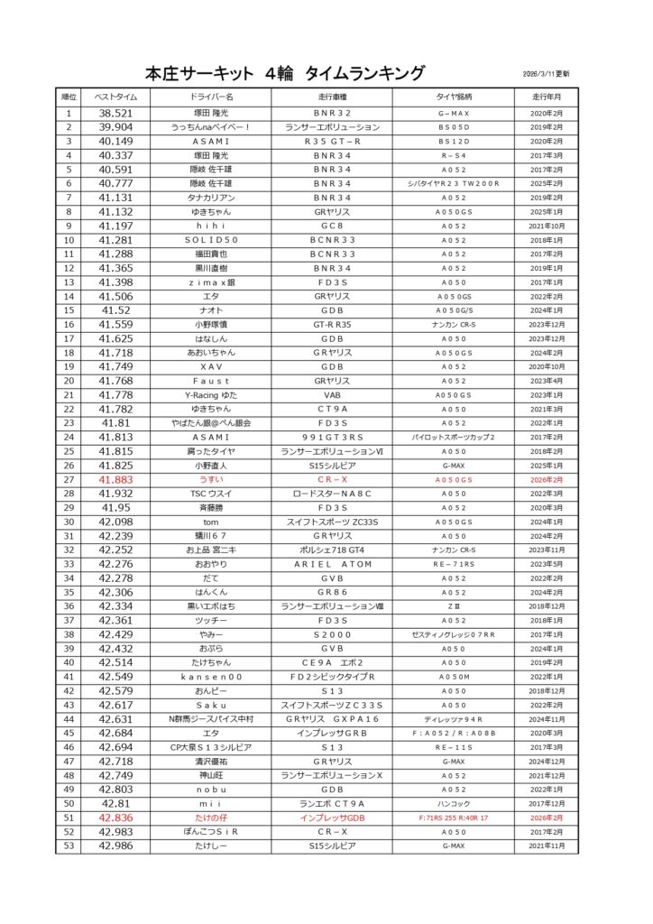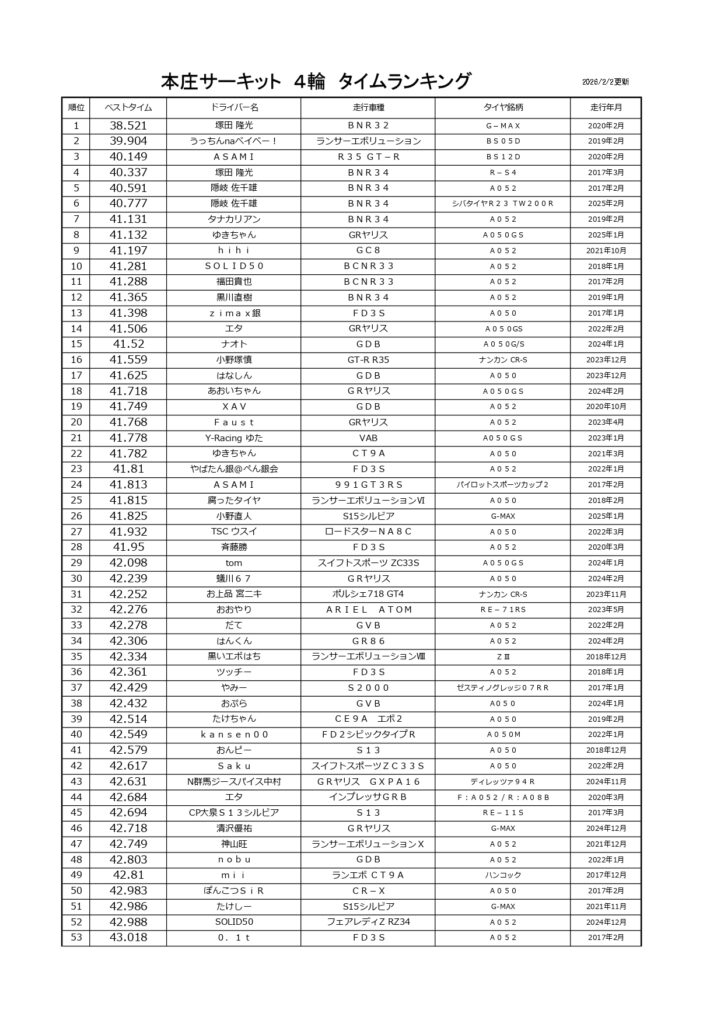 タイムランキングフリー走行日・本庄主催イベント・貸切走行会問わず当社貸計測器を使用の方でしたらどなたでも登録無料♪掲載項目は、ドライバー名(ハンドルネーム可)・走行車種・タイヤ銘柄・走行年月です!登録ご希望の方は、走行終了後に受付スタッフまでお気軽にお声がけください☆赤字は3か月以内にタイム更新された方コースレコードタイムはこちら