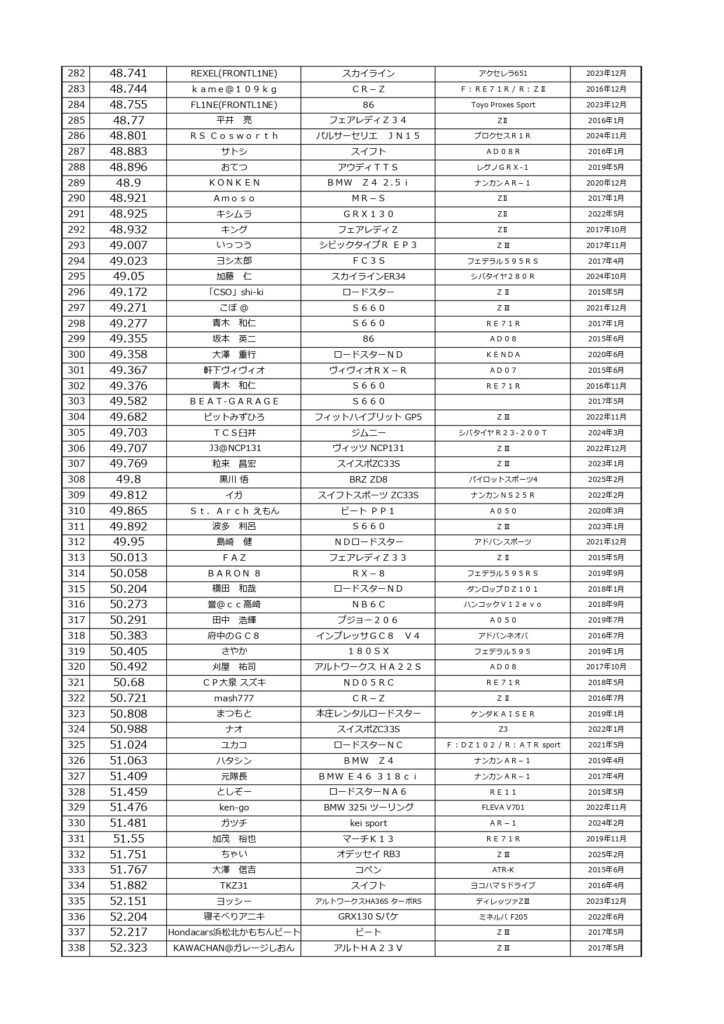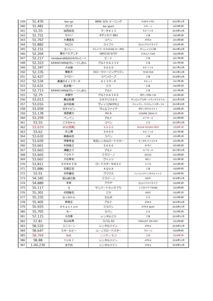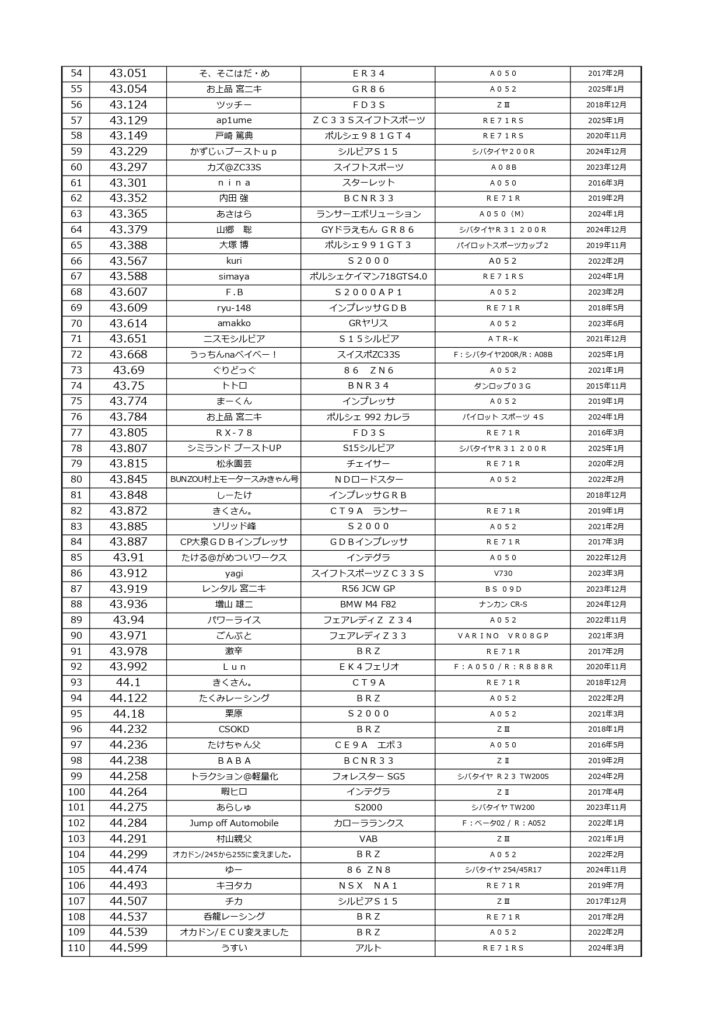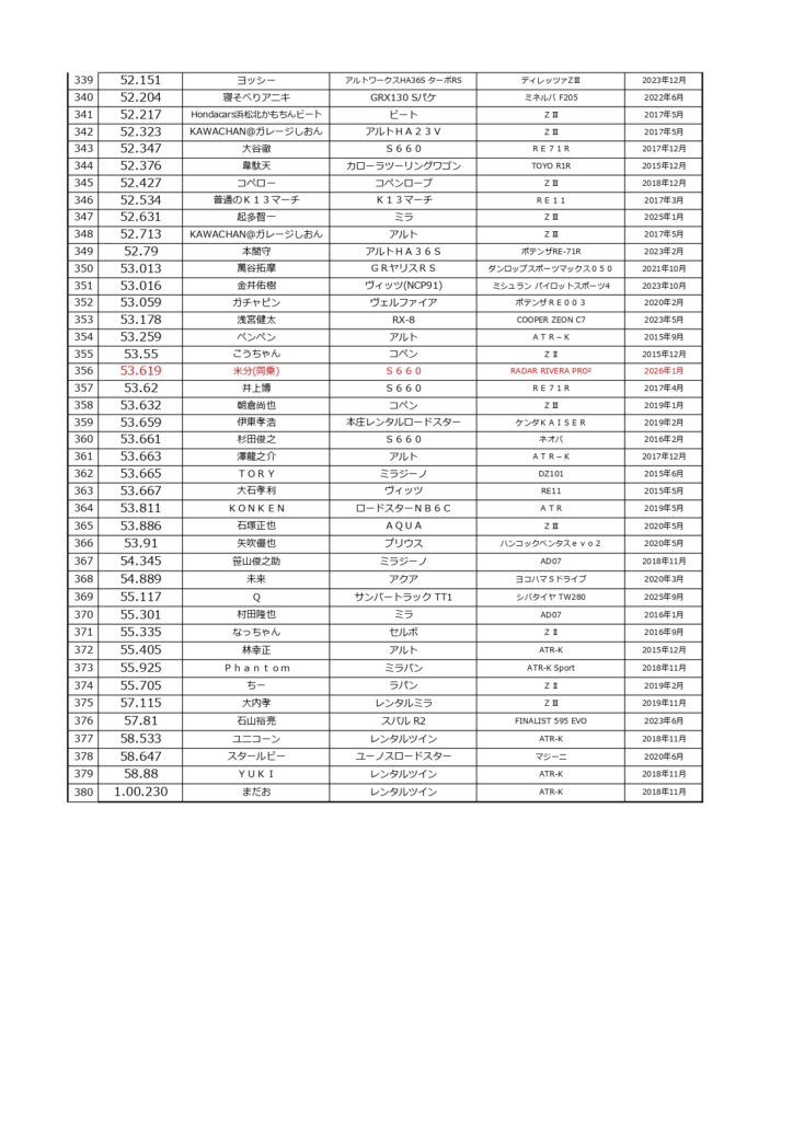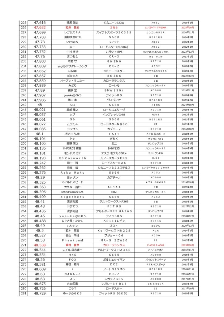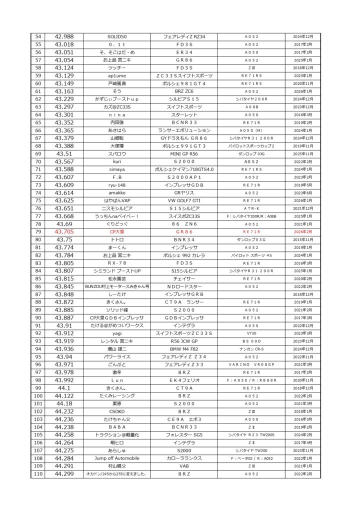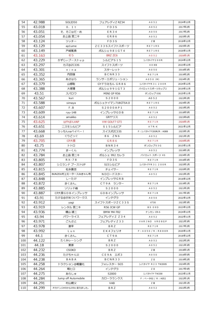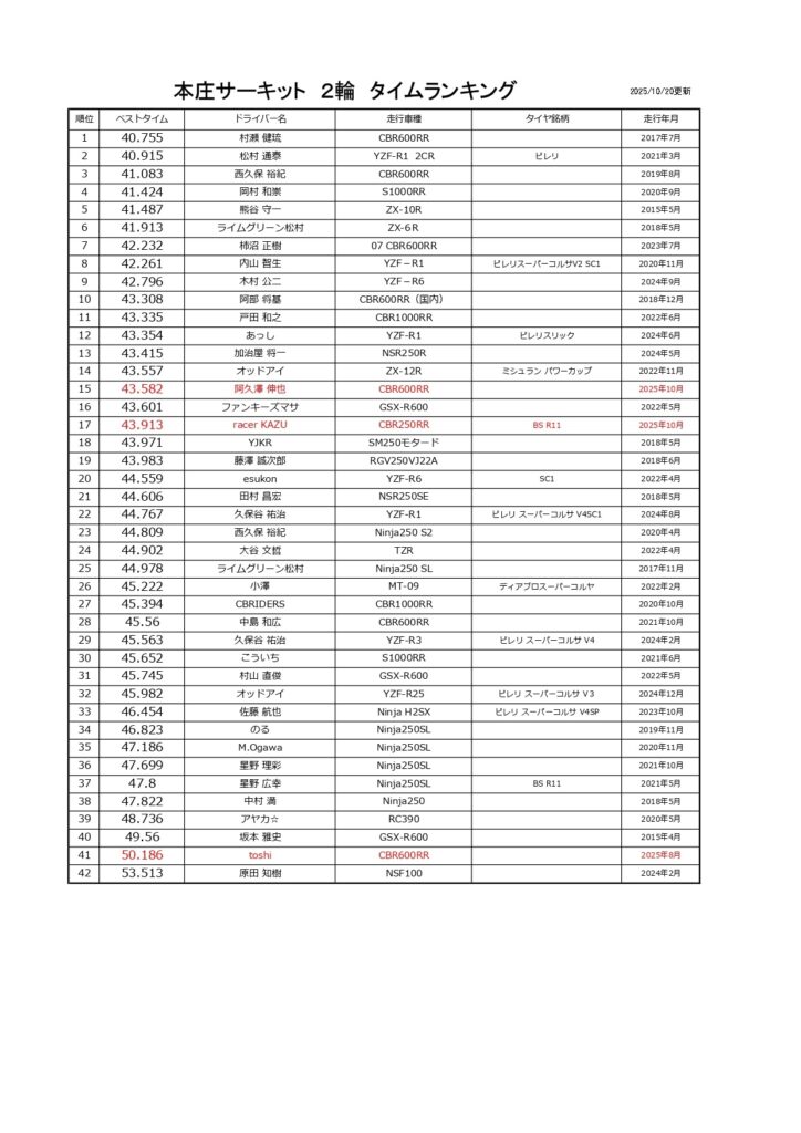 タイムランキングフリー走行日・本庄主催イベント・貸切走行会問わず当社貸計測器を使用の方でしたらどなたでも登録無料♪掲載項目は、ドライバー名(ハンドルネーム可)・走行車種・タイヤ銘柄・走行年月です!登録ご希望の方は、走行終了後に受付スタッフまでお気軽にお声がけください☆赤字は3か月以内にタイム更新された方コースレコードタイムはこちら