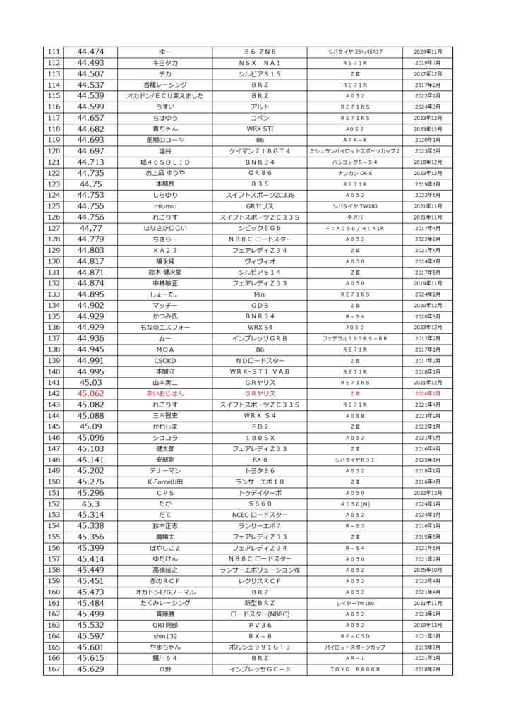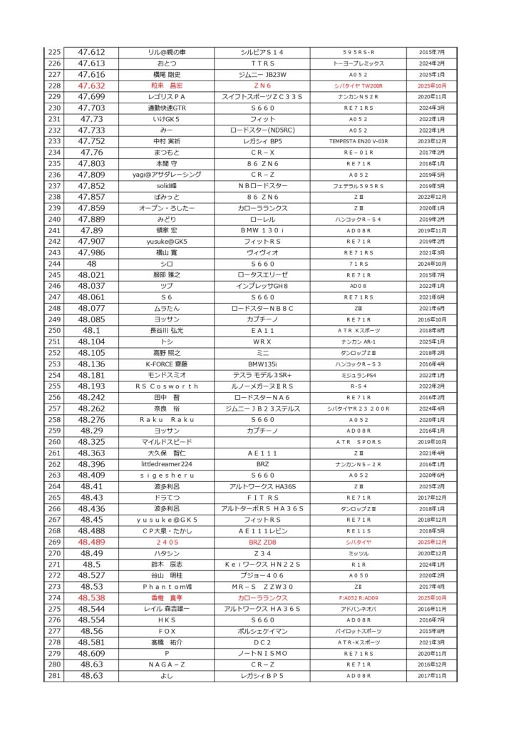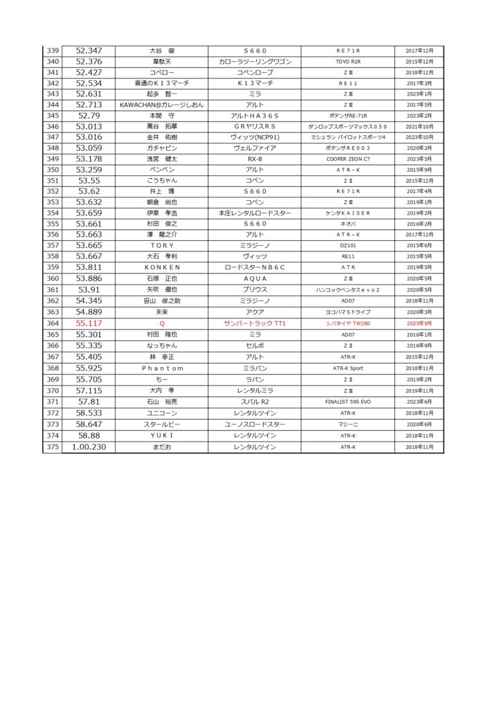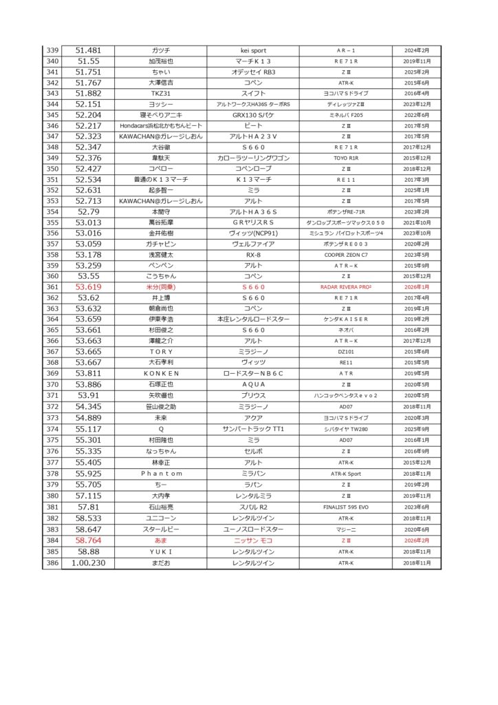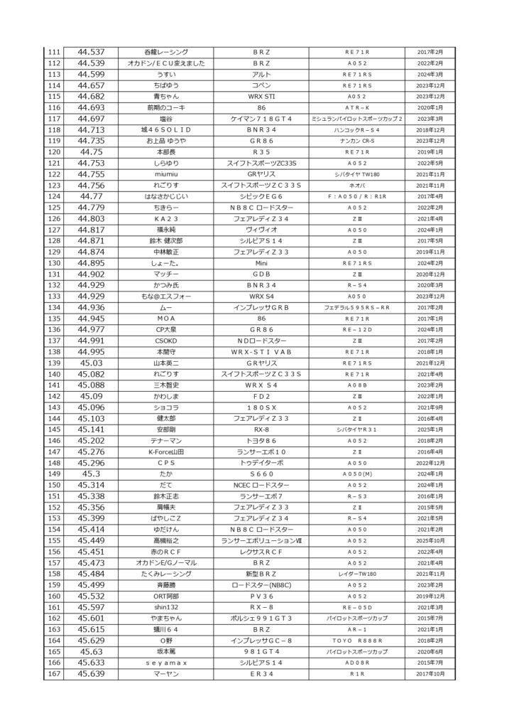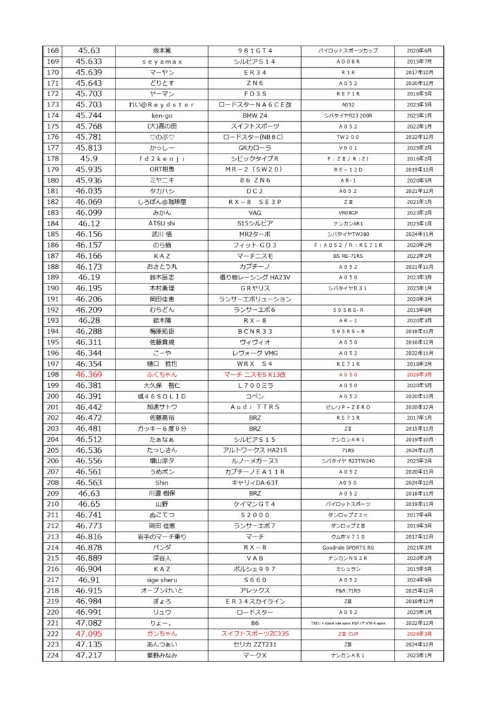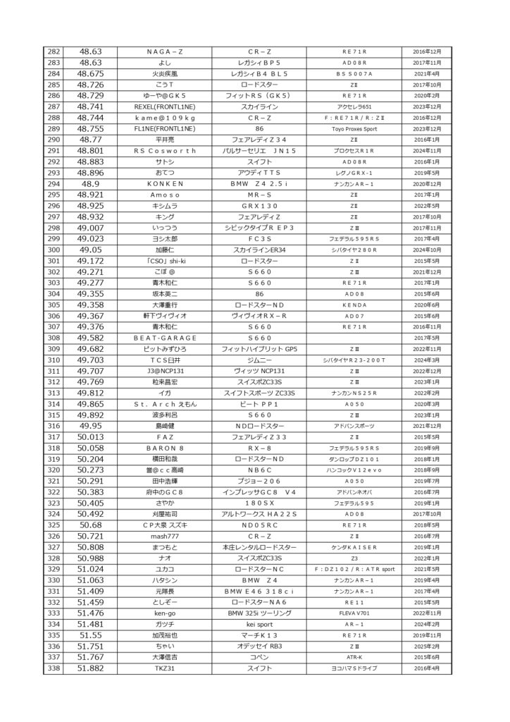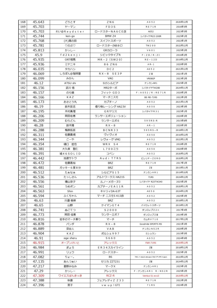 タイムランキングフリー走行日・本庄主催イベント・貸切走行会問わず当社貸計測器を使用の方でしたらどなたでも登録無料♪掲載項目は、ドライバー名(ハンドルネーム可)・走行車種・タイヤ銘柄・走行年月です!登録ご希望の方は、走行終了後に受付スタッフまでお気軽にお声がけください☆赤字は3か月以内にタイム更新された方コースレコードタイムはこちら