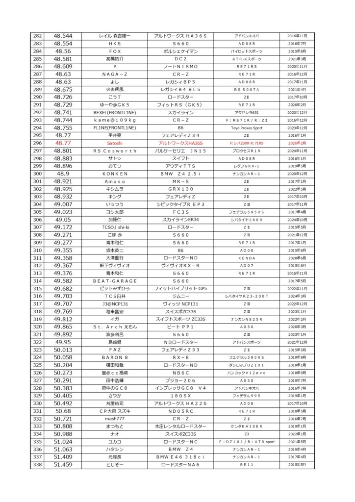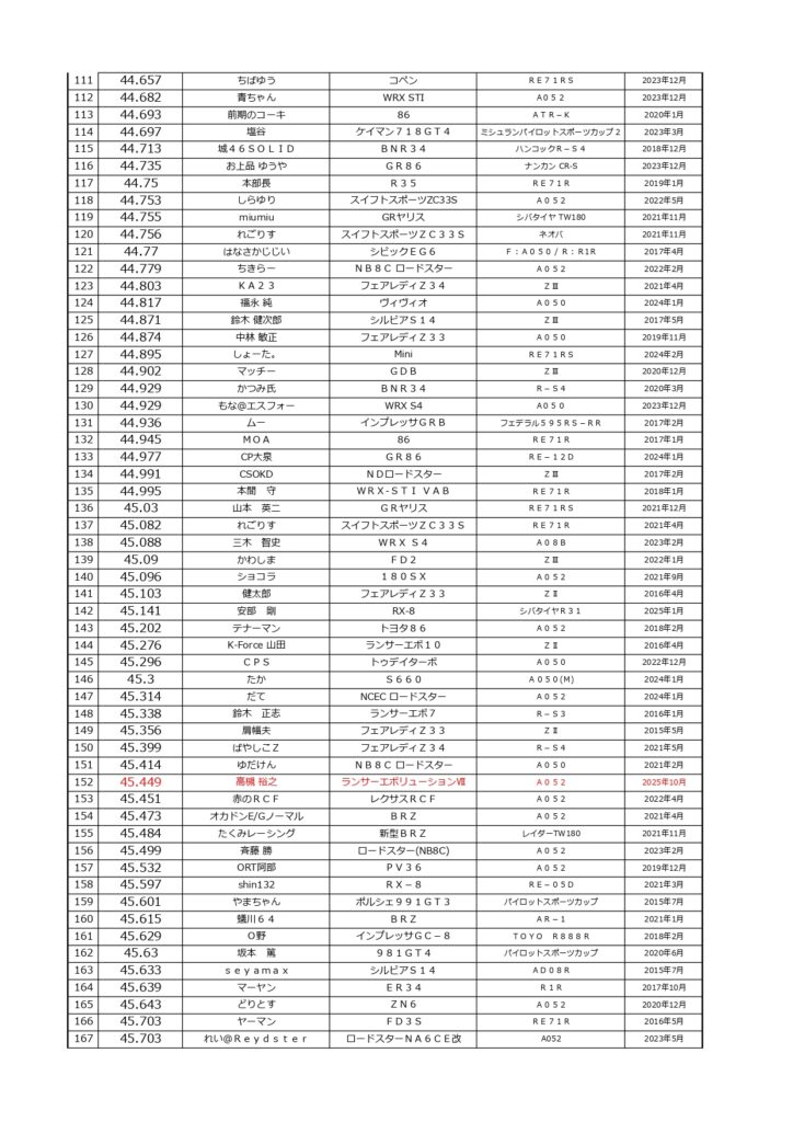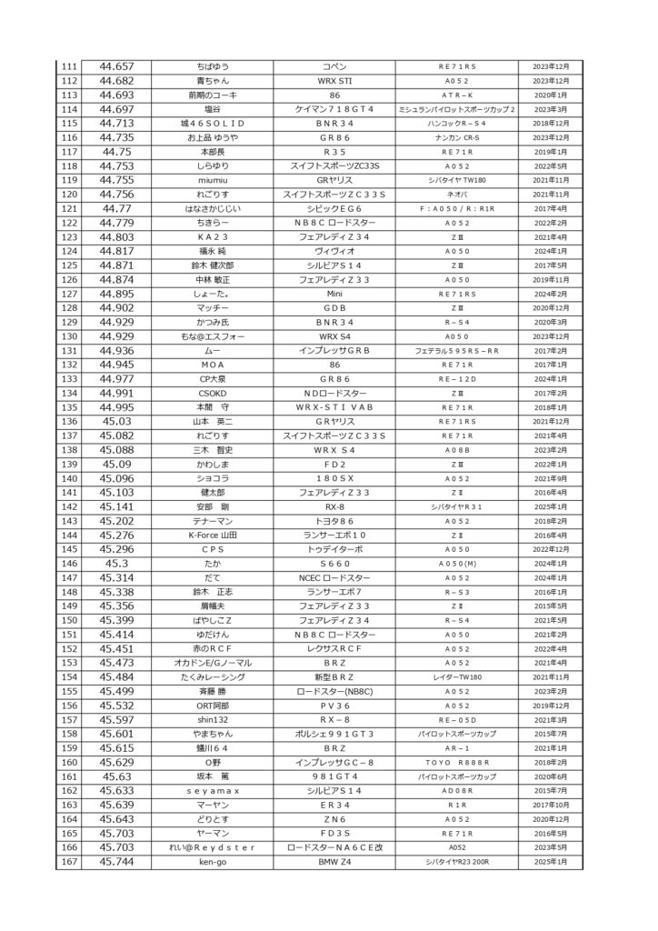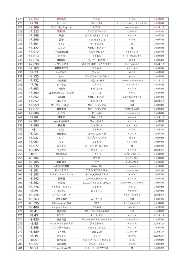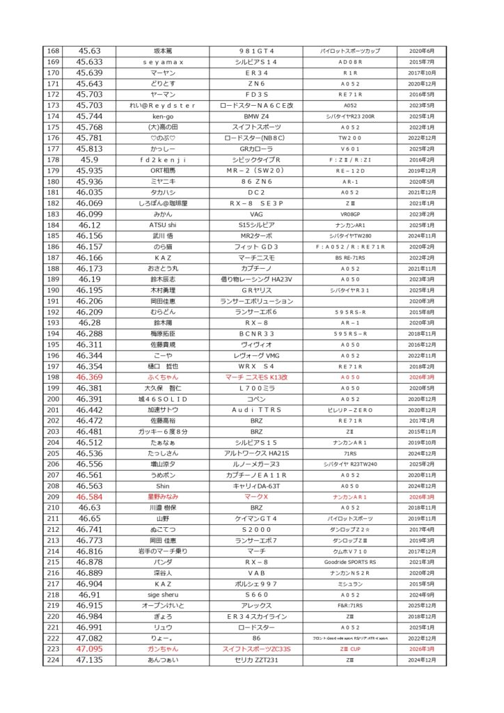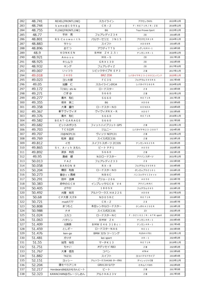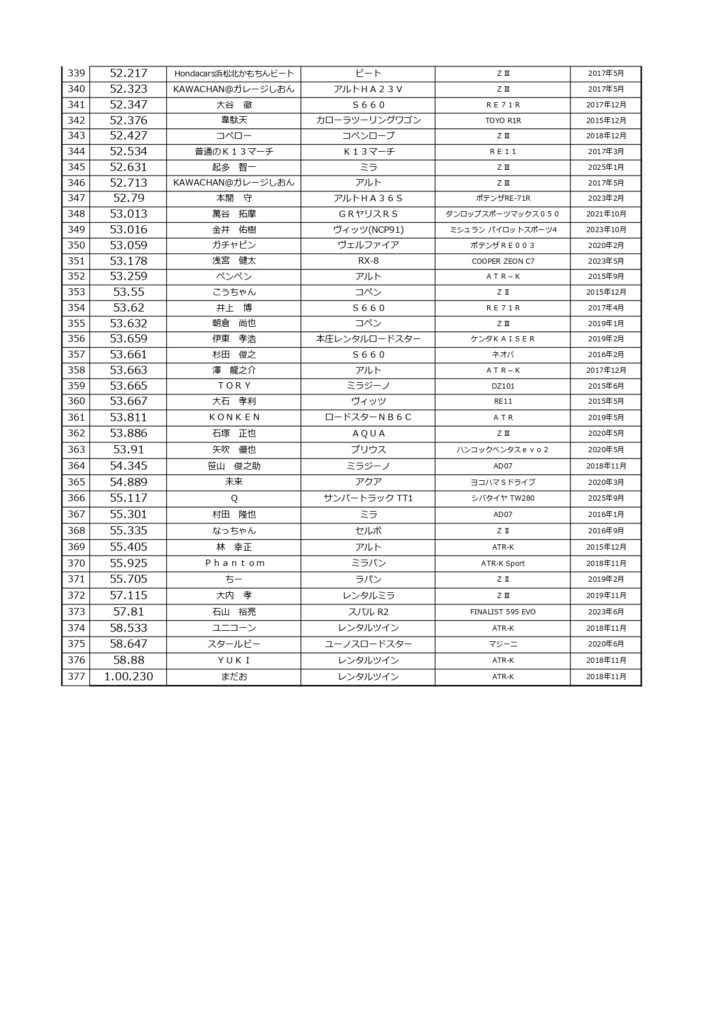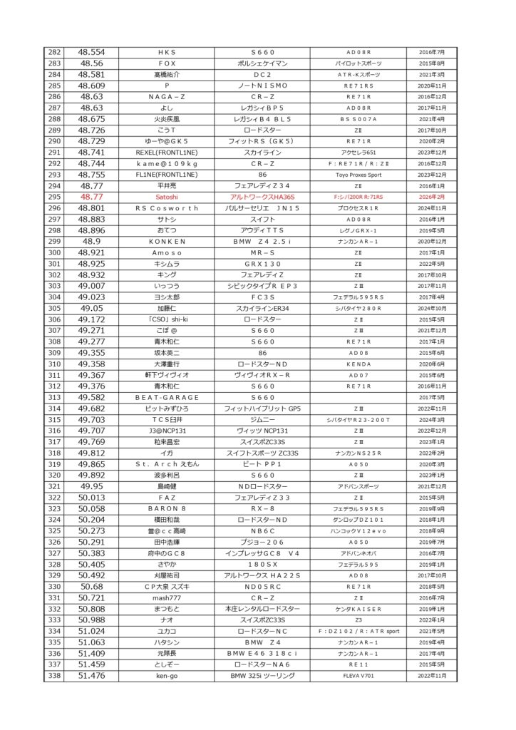 タイムランキングフリー走行日・本庄主催イベント・貸切走行会問わず当社貸計測器を使用の方でしたらどなたでも登録無料♪掲載項目は、ドライバー名(ハンドルネーム可)・走行車種・タイヤ銘柄・走行年月です!登録ご希望の方は、走行終了後に受付スタッフまでお気軽にお声がけください☆赤字は3か月以内にタイム更新された方コースレコードタイムはこちら